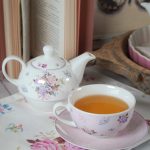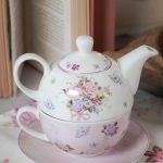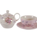 Porcelain tea set for one person. Cute set with a small tea pot and a cup with saucer.