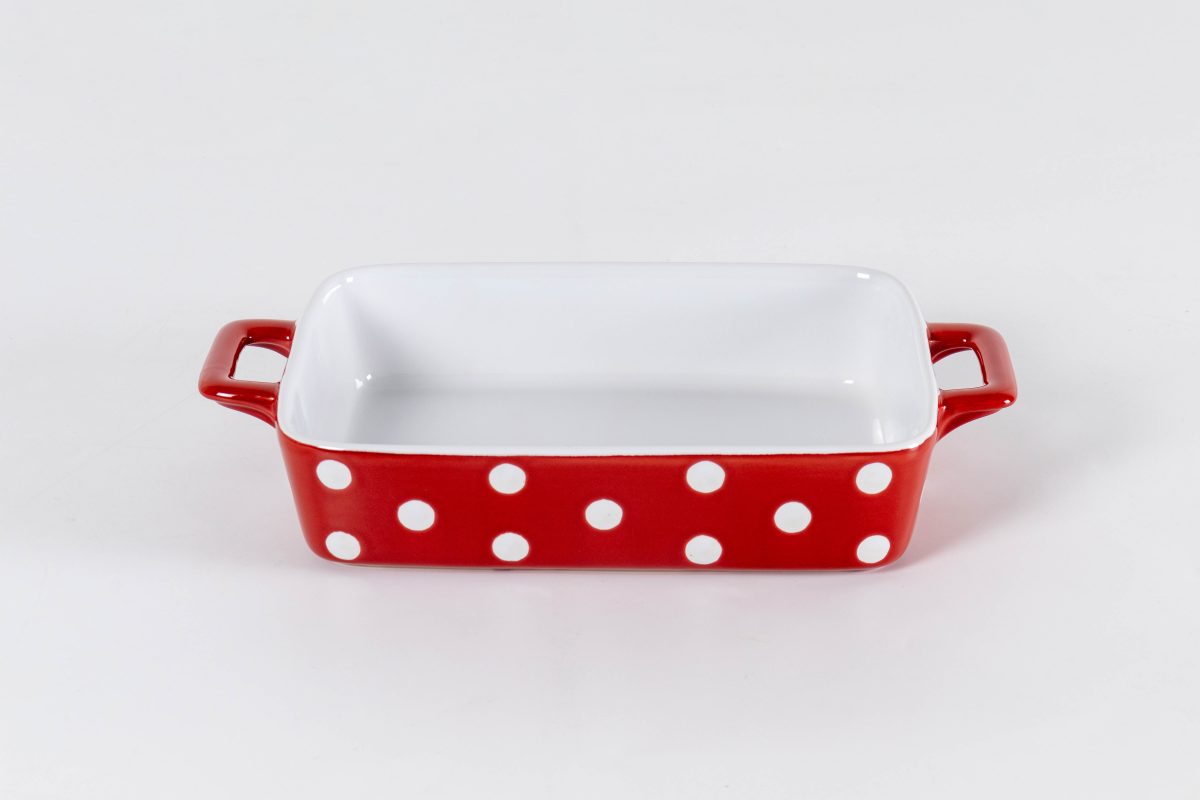 Red small dish with dots can be used for any food and it is perfect for two person. Can be used in the dishwasher, oven & microwave.